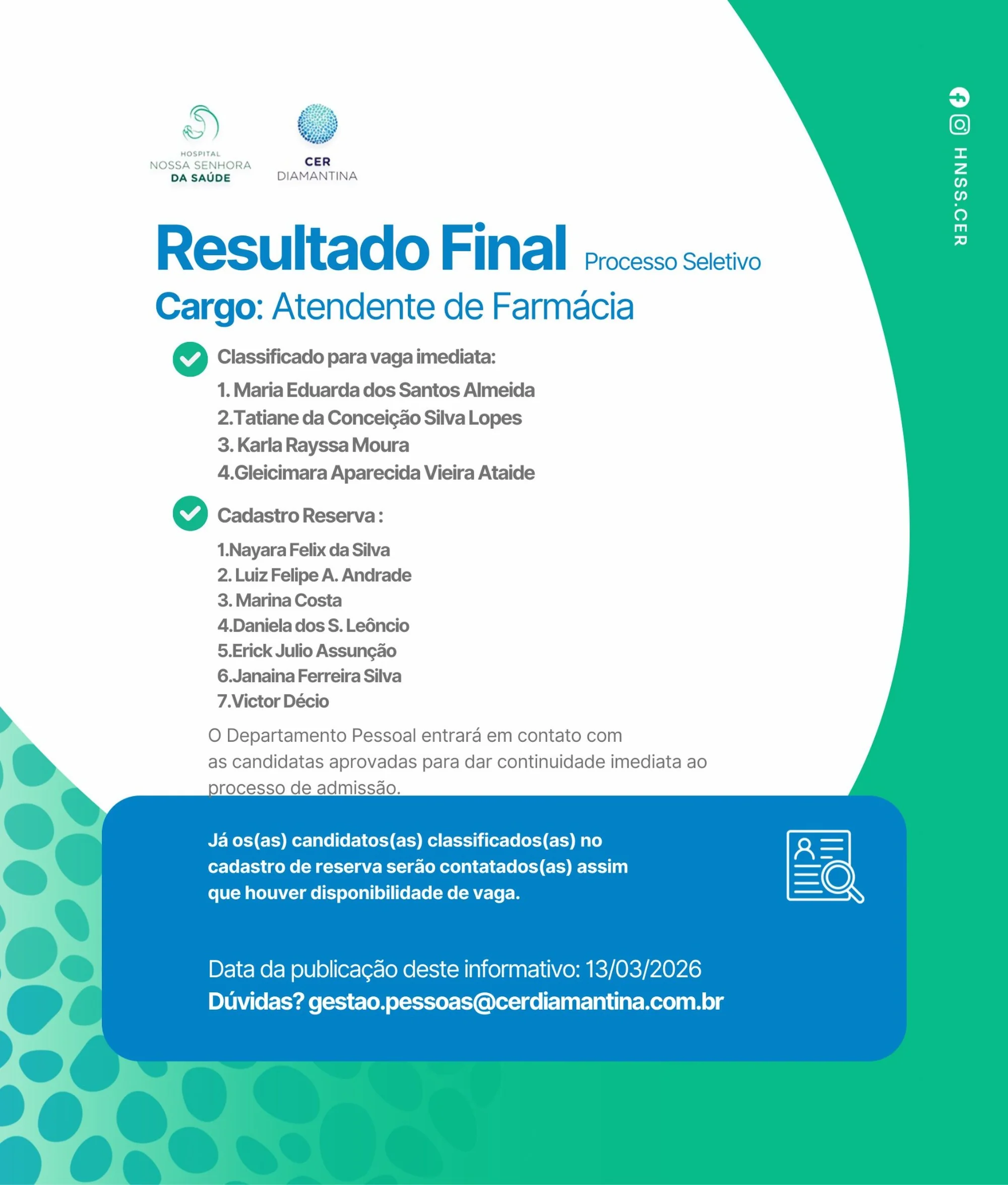 A Irmandade de Nossa Senhora da Saúde de Diamantina torna pública a disponibilização, na presente data, nos sítios eletrônicos do Hospital Nossa Senhora da Saúde (www.hnss.org.br) e do CER Diamantina (www.cerdiamantina.com.br), sua filial, a lista de candidatos(as) selecionados(as) para a vaga de Atendente de Farmácia.
