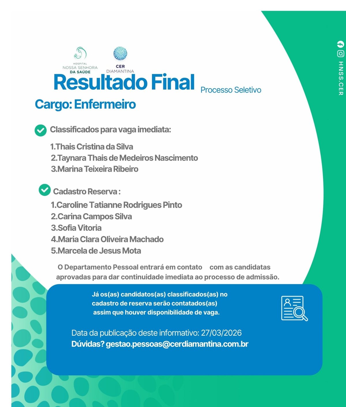 A Irmandade Nossa Senhora da Saúde de Diamantina torna pública a disponibilização, na presente data, nos sítios eletrônicos do Hospital Nossa Senhora da Saúde (www.hnss.org.br) e do CER Diamantina(www.cerdiamantina.com.br), sua filial, a lista de candidatos (as) selecionados (as) para a vaga Enfermeiro.