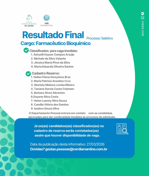 A Irmandade Nossa Senhora da Saúde de Diamantina torna pública a disponibilização, na presente data, nos sítios eletrônicos do Hospital Nossa Senhora da Saúde (www.hnss.org.br) e do CER Diamantina(www.cerdiamantina.com.br), sua filial, a lista de candidatos (as) selecionados (as) para a vaga de Farmacêutico Bioquímico.
